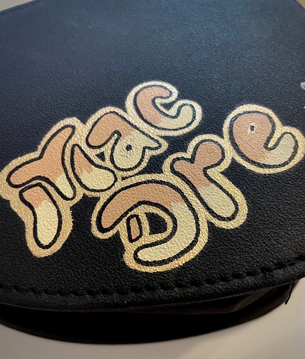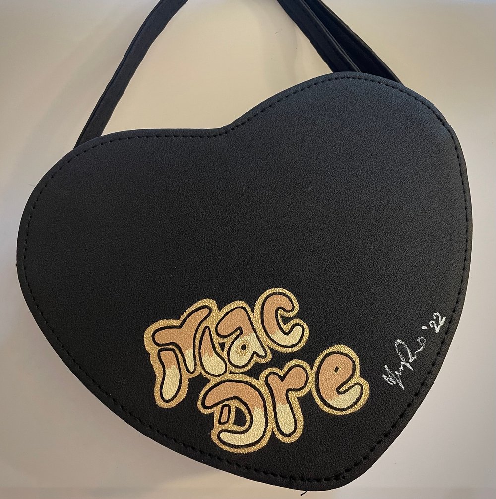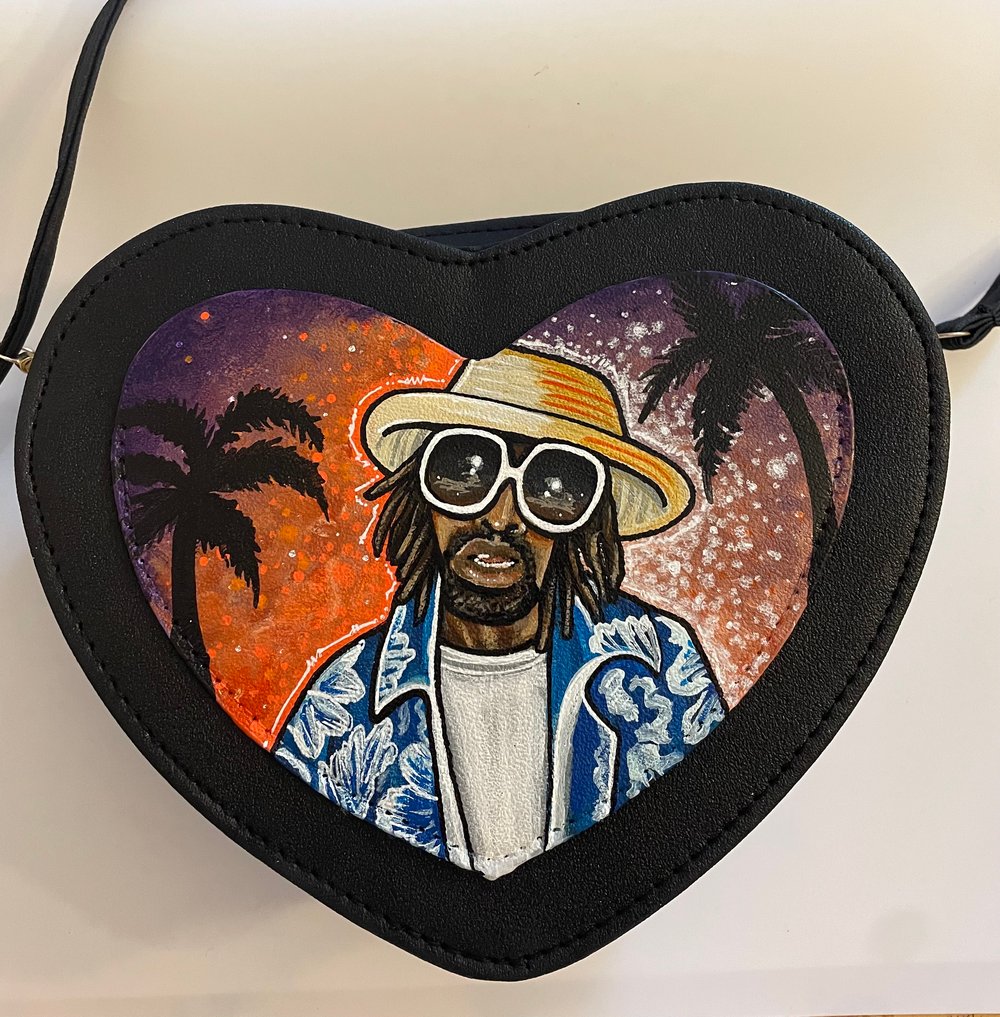 Hand Painted Heart Purse of Mac Dre by artist Monica Robledo. This purse is faux leather and measures roughly 8"x7"x2".